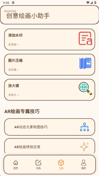 3、工具页面包含添加水印、图片压缩、放大镜功能,此外还设有AR绘画的专属技巧板块。