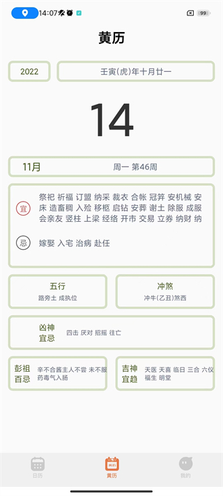 大家可以看到这里有详细的黄历页面,各项宜忌事项都标注得十分清楚。