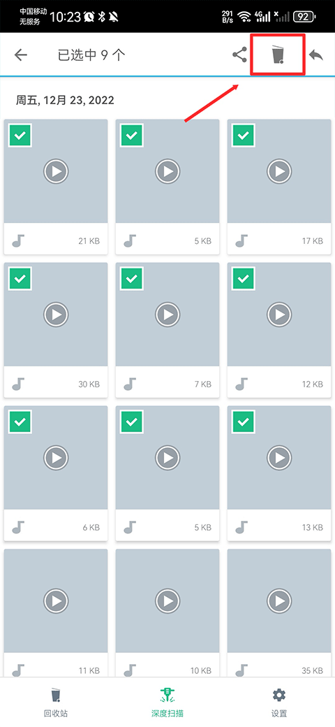 2、批量选中所有要删除的文件,接着点击页面右上角的垃圾桶图标。
