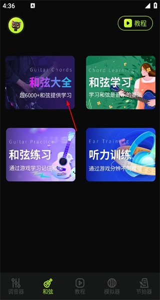 2、点击和弦按钮进入和弦页面后,能看到和弦大全等功能选项,可通过选择对应功能来学习各类和弦知识。
