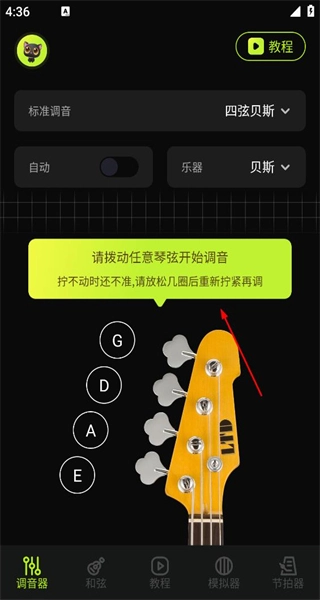 1、启动软件后,进入调音器界面,选择四弦贝斯模式,看到关于拨动琴弦来调音的提示信息,为乐器调音操作做好准备。