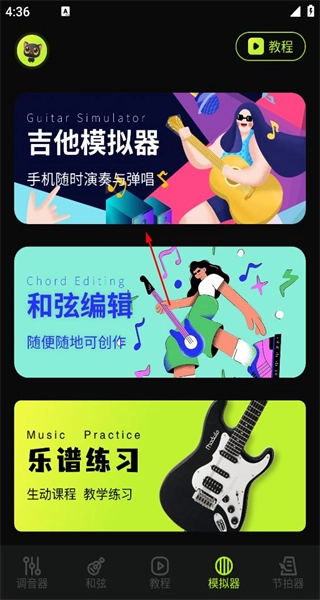 4、点击模拟器按钮进入对应的页面后,能看到吉他模拟器等功能选项,接下来就可以借助这些模拟器开展弹奏练习了。
