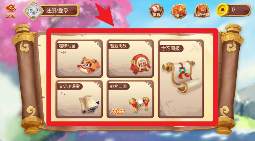 2、在首页能够选择三国小百科、大探险家、西游小百科或者桌游教学等栏目,从而进入不同的学习体验模块。