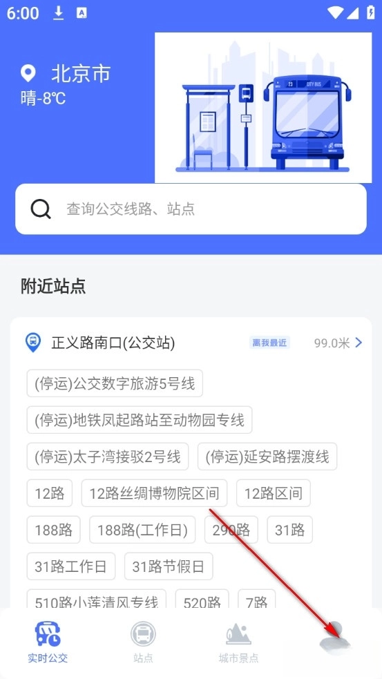 【附近站点】可自动定位您的当前位置,为您展示周边的站点及线路信息。