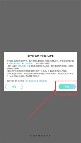 1、在弹出的【用户服务协议和隐私政策】窗口中,点击【同意】按钮,确认接受相关协议后,即可进入应用的后续操作流程。