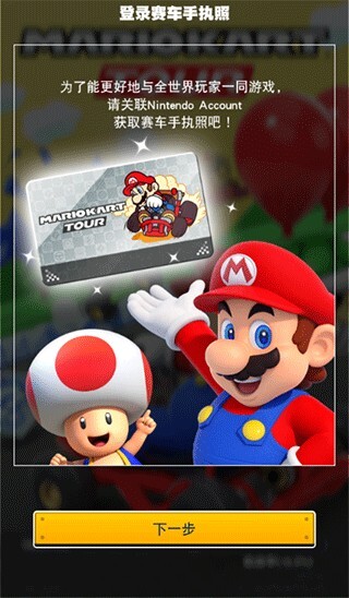 1、游玩手机版《马里奥赛车巡回赛》需要Nintendo Account账号,进入游戏时会弹出该账号的登录提示,点击“下一步”操作即可