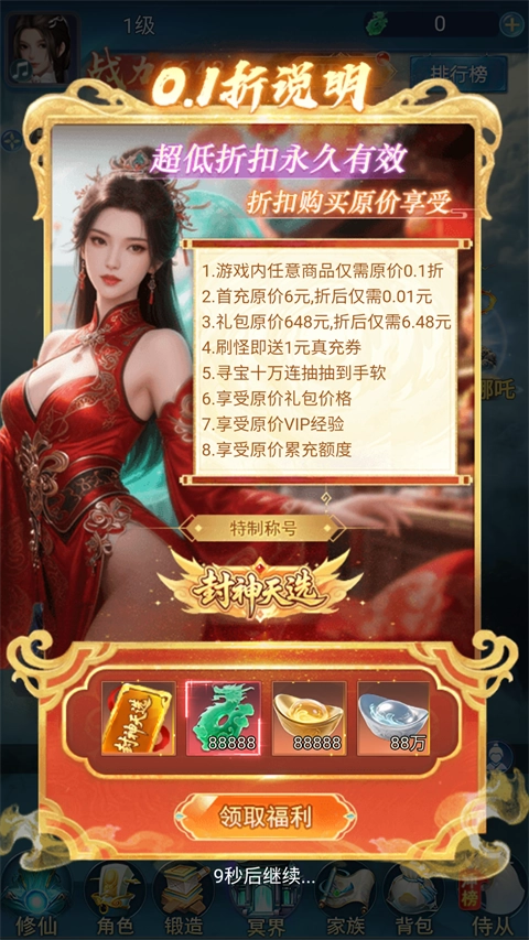 【少年封神】全平台充值永久享0.1折优惠,648元档位仅需支付6.48元即可畅享对应福利