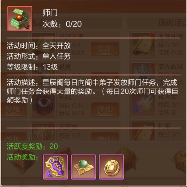结束师门任务后,可在周一至周五的中午12点到午夜12点期间,通过活动界面参与龙渊初考的答题环节,每次答题都能获得丰富的经验奖励。