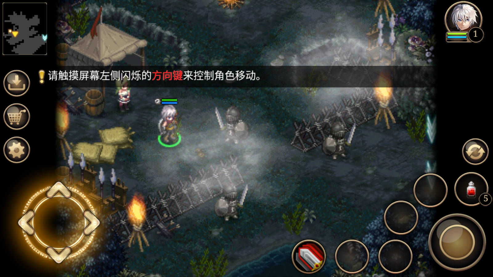 玩家可借助方向键操控角色移动,界面右侧设有角色的行动栏、技能栏与道具栏。