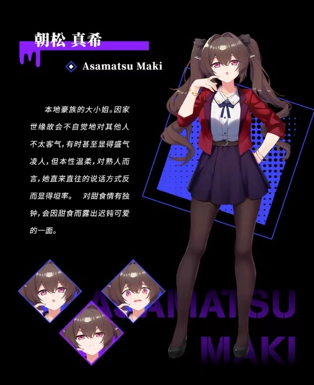 本地望族的千金小姐。受家世背景影响,她常不自觉地对旁人态度略显倨傲,偶尔甚至带着几分盛气凌人,但内心实则温柔。在熟人眼中,她直截了当的说话风格反倒透着一股率真。她对甜食有着难以抗拒的偏爱,每每面对甜食时,便会流露出些许迟钝又可爱的模样。