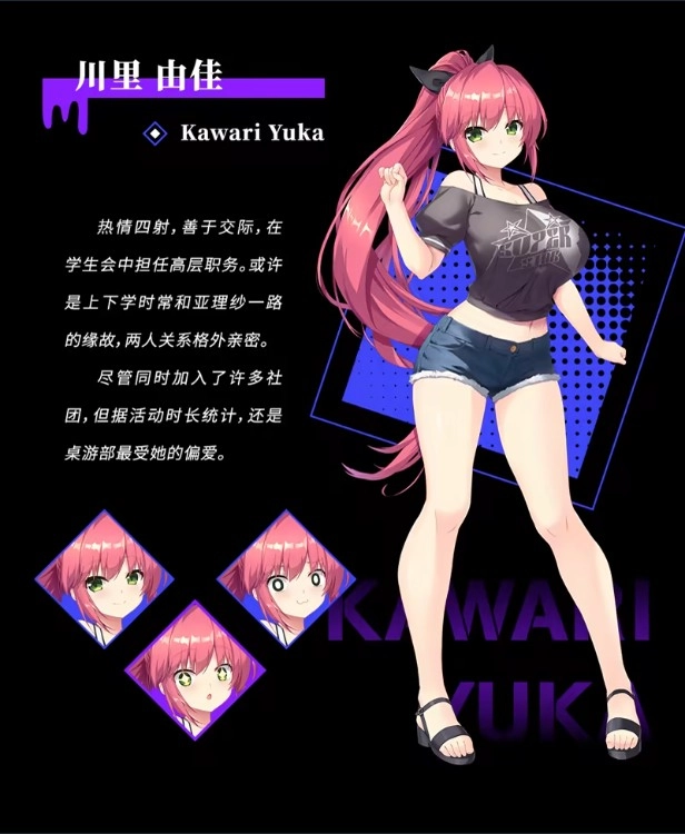 桌游部的成员,是个十足的小恶魔。因为社团里有位很厉害的大小姐,她对自己出身平凡这件事有点自卑,所以在社团活动中两人经常合不来。她的兴趣是绘画,在平面设计方面好像也很有本事。