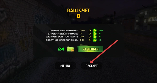 游戏结束后玩家可以获得游戏奖励,要是玩家想重新游玩,点击屏幕下方的РЕСТАРТ,就能再次挑战来提高驾驶表现。