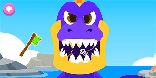 在刷牙游戏里,玩家需要拖动牙刷,把恐龙嘴巴里的污渍都清理干净就能通关啦。