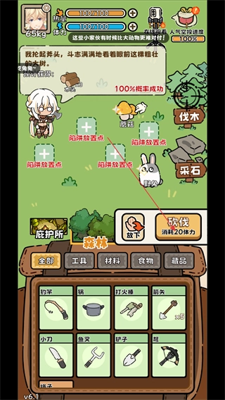 点击下方工具栏里的斧子,接着点击砍伐按钮,消耗20点体力值就能得到3块木头。